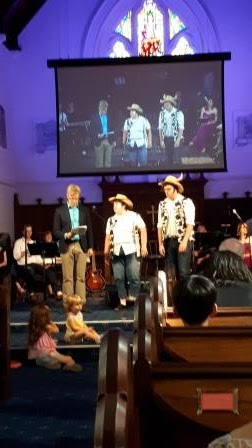 One of the ministers plays the role of the host of a fictional TV show, Straight from the Horses Mouth; a show where the host interviews animals. This evening, he'll interview the donkey that carried Mary to Bethlehem, three of the sheppard's sheep that lay waiting, two of the cows present in the manger, and one of the wise men's trusty camels. The program is clever, cute and humorous and while its entertaining the audience, it's telling the Christmas Story.The little ones gather in front of the alter and are permitted to dance at will. They are quite cute.